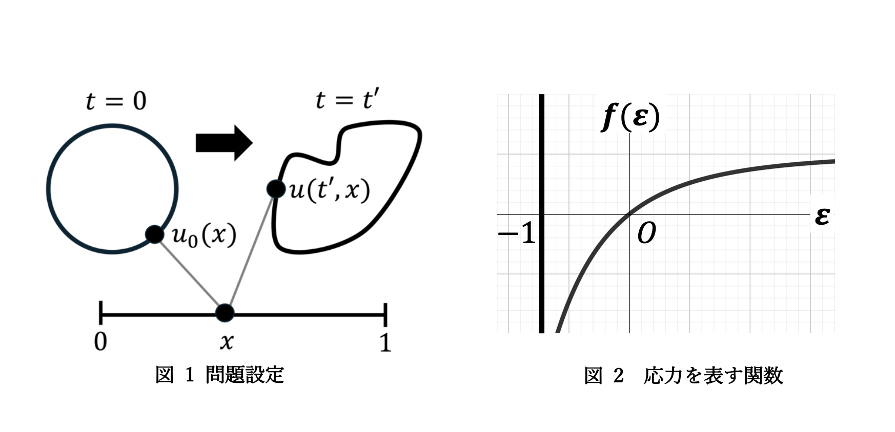 博士論文では、まず、弾性閉曲線の伸縮運動を表す方程式として、エネルギー保存則から上述の方程式を導出しました。そして、この初期値境界値問題を平面上の弾性閉曲線の伸縮運動を表す微分方程式モデルとして定式化するために、その数学的適切性を考察しました。より具体的には、この問題の解の存在や一意性を数学的に示しました。 その際、 従来のモデルでは得られていない「歪みが \(-1\) より大きくなることを保証する良い評価」を解の性質として得ることができました。一方、このモデルの構築では、現象を簡略化し「弾性体の大きな動きも表現できる応力の数学的表現として特異性をもつ関数を定式化」することに焦点を当てていました。そのことから次の研究段階として、重力や曲率も考慮したモデルの考察が課題として挙げられます。