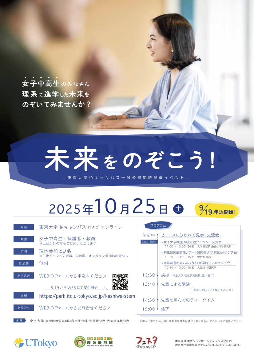 10月24日(金)から開催される「東京大学柏キャンパス一般公開2025」同時開催イベント「未来をのぞこう!」がハイブリッドにて開催されます。リアルで最先端な理系の現場を、先輩たちとの交流を通して体験し、女子中高生のみなさんの理系進路選択を応援するイベントです。